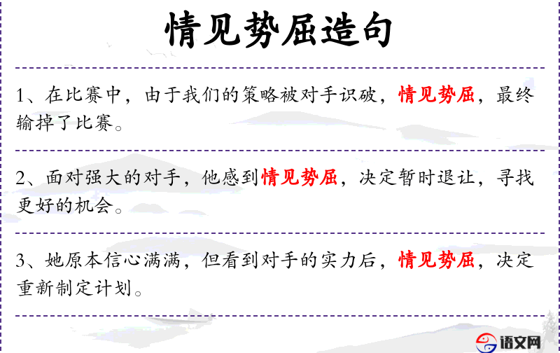 句子中的“情见势屈”是一个成语,源自古代兵法,表示在实际战斗中遇到困难。这个成语体现了人对实际经验和灵活应对的重视。