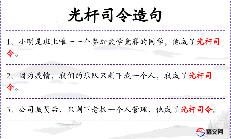 1. 【光杆司令】 形容只剩下孤单一人,没有任何人帮助。