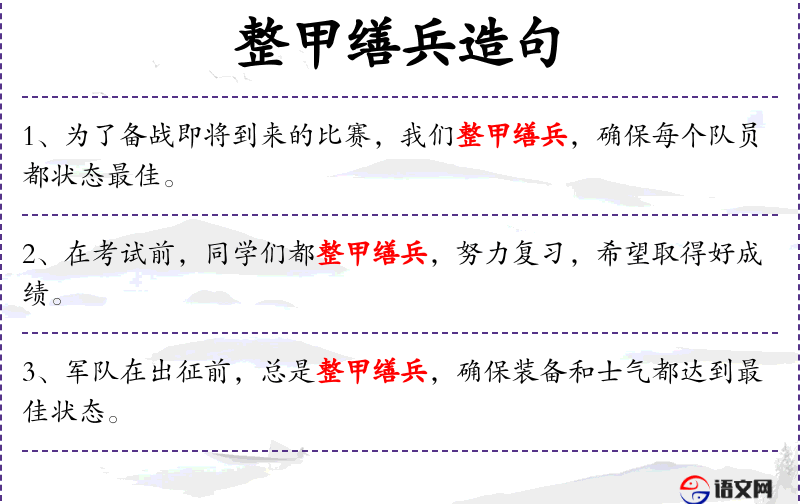 - 宾语:每场比赛前都要整甲缮兵,不能有丝毫松懈