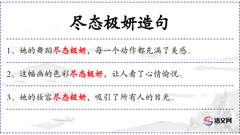 - 尽态极妍:美艳绝伦、艳丽无比、倾国倾城。