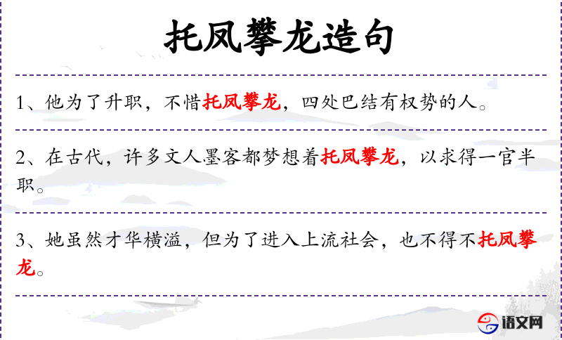 • 成语典故:“托凤攀龙”比喻依附有权势的人以谋求升官发财,源自古代对凤凰和龙的崇拜。