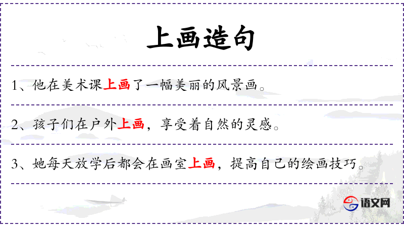 3. 【风景画】 - 以自然景观及村庄、都市为题材的绘画。中国传统绘画中的山水画本质上也是风景画,但通常所说的风景画,主要用于油画、水彩画等近代西方传入中国的画种。美术史上,风景画是由人物画的背景逐渐发展为独立画科的。