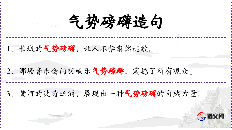 1. 【气势磅礴】 - 磅礴:广大无边的样子。形容气势雄伟壮大。