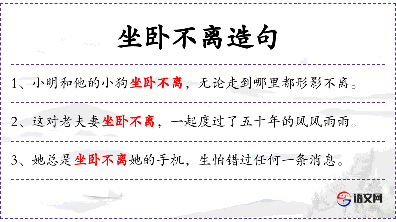 - 坐卧不离:形容非常依赖或离不开某物,相关词汇有“形影不离”、“寸步不离”。
