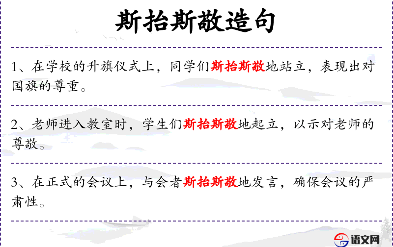 - 斯抬斯敬地:形容词短语,表示举止得体、礼貌周到。