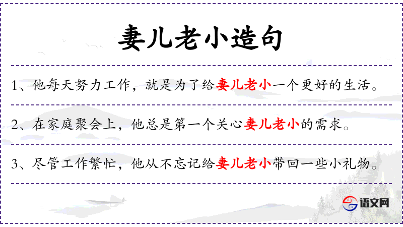 - 妻儿老小:指家庭成员,包括妻子、孩子和老人。