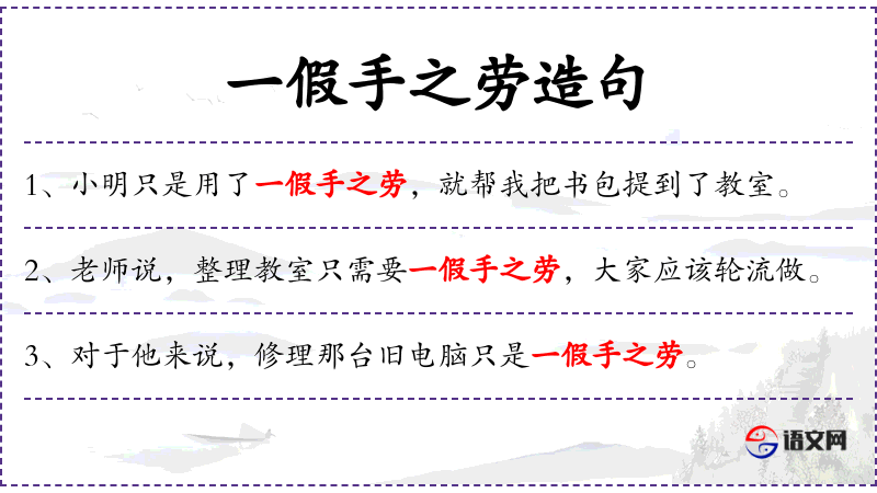 - 宾语:整理教室只需要一假手之劳,大家应该轮流做