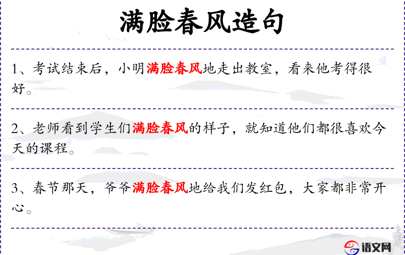 2. 【满脸春风】 - 形容心情喜悦,满脸笑容。