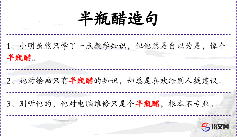 - 文化背景:在**文化中,“半瓶醋”是一个常用的比喻,用来形容某人知识或技能不全面。