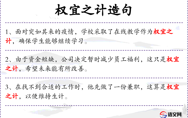6. 【权宜之计】 权宜:暂时适宜,变通;计:计划,办法。指为了应付某种情况而暂时采取的办法。