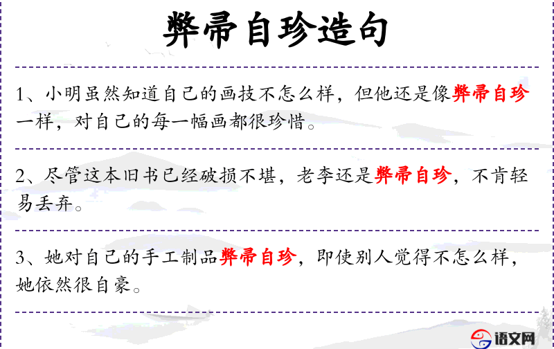 - 弊帚自珍:比喻对自己不值钱的东西也珍爱,源自成语“弊帚千金”。