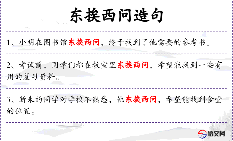 句子:“为了完成作业,小丽在图书馆东挨西问,寻找相关的书籍和资料。”