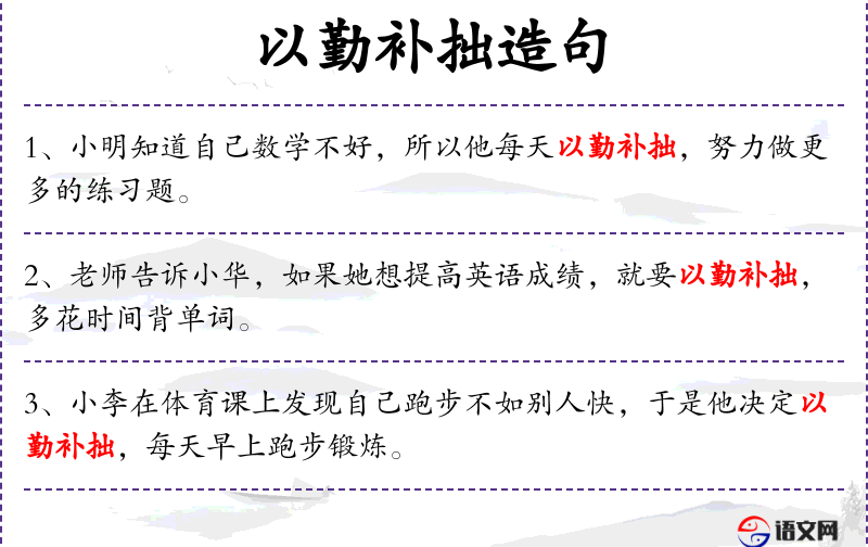 - 通过:介词,表示手段或方式。 *. 以勤补拙:成语,意思是勤奋可以弥补不足。