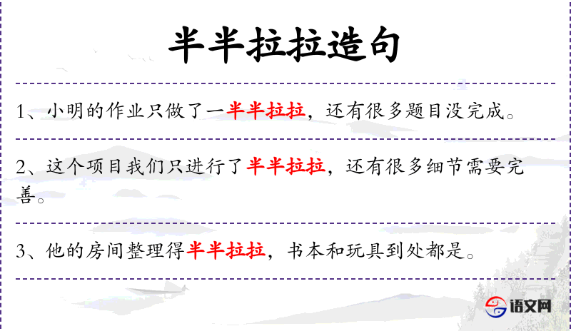 - 一半半拉拉:口语表达,意指不完全、不完整的状态。