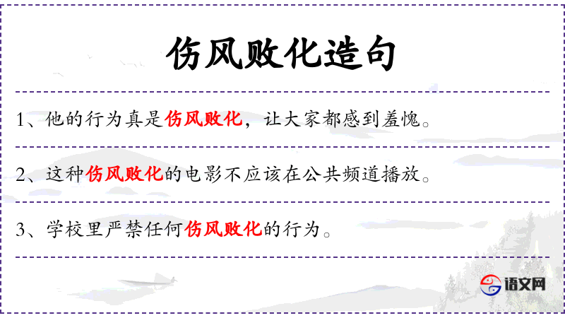 - 伤风败化:指违背社会道德、败坏风气的行为。