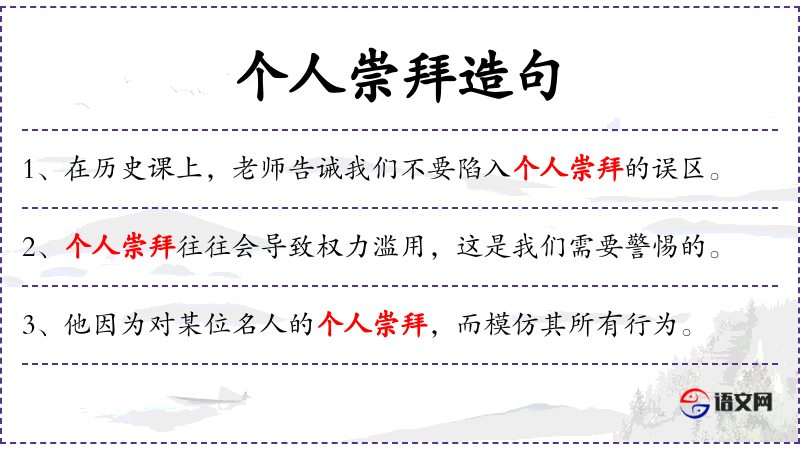 - 个人崇拜:指对某个人物的过度尊敬和追随。