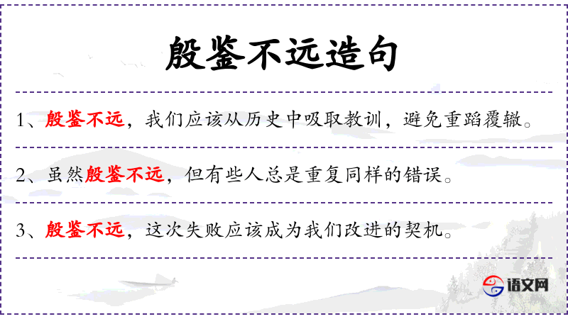 5. 【殷鉴不远】 - 殷:指商朝后期;鉴:镜子。指殷商子孙应以夏的灭亡为借戒。后泛指前人的教训就在眼前。