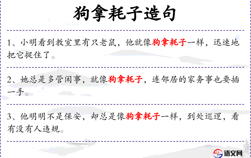 (歇后语)多管闲事。狗的职责是看守门户,猫是专捉老鼠的,所以狗替猫捉老鼠,就是多管闲事。