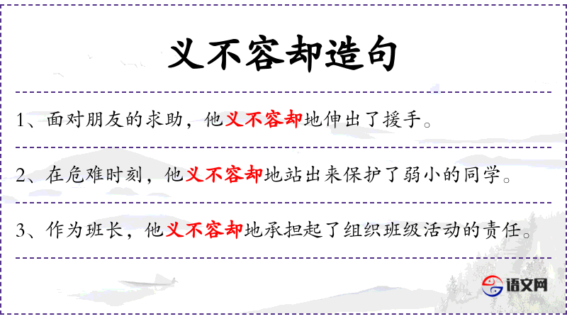 - 义不容却地:毫不犹豫地、坚决地、果断地