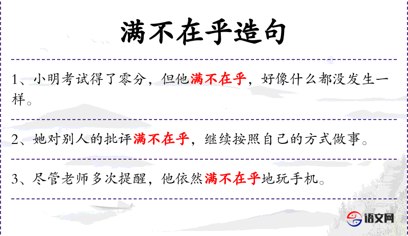 4. 【满不在乎】 - 满:全;在乎:在意。丝毫不在意。形容对事情一点也不重视。