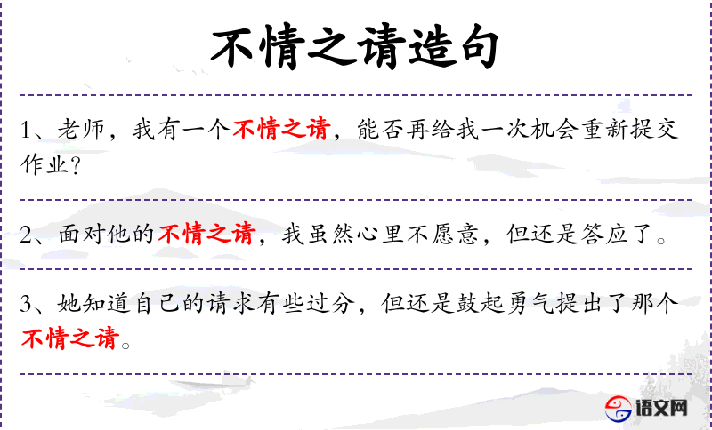 - 一个不情之请:一种委婉的请求,表示请求者自己也觉得不太合适或有些过分。