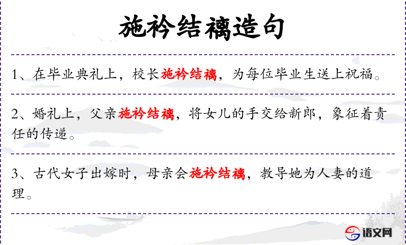 - 施衿结褵:这是一个成语,意为在女儿出嫁时,父亲为她系上腰带和头巾,象征着将女儿交给新郎,意味着责任的传递。