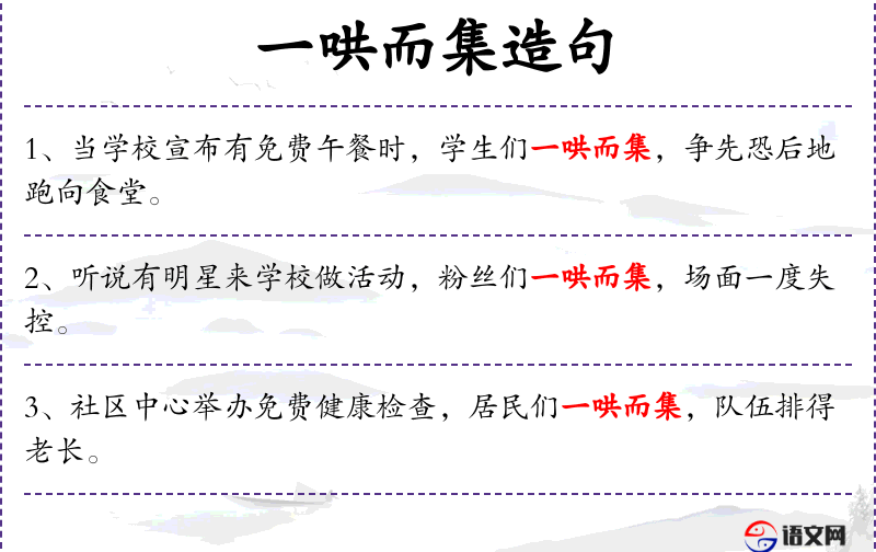 1. 【一哄而集】 - 哄:喧闹。一阵喧闹,人们都起来了。形容自发地行动起来。
