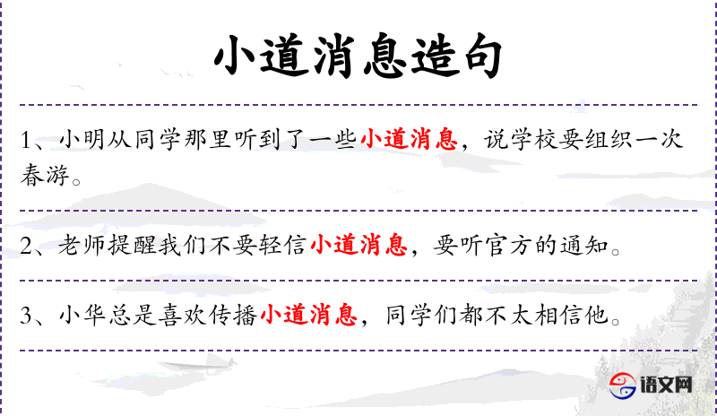 - 小道消息:名词,指非官方的、未经证实的消息。