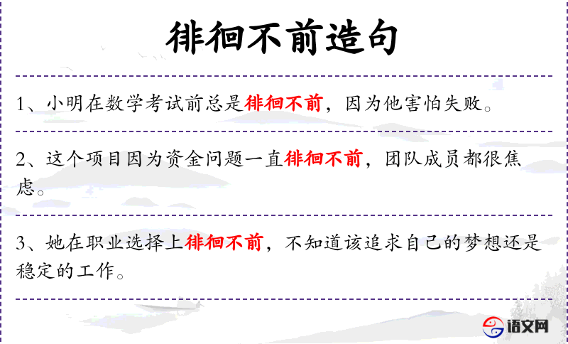 3. 【徘徊不前】 徘徊:来回地行走。犹豫不决,停步不前。比喻总在一个地点不能前进。
