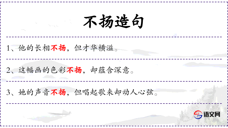 1. 【不扬】 - 不损伤; 不能散发; 不振作; 亦作"不扬"。谓容貌不英俊。
