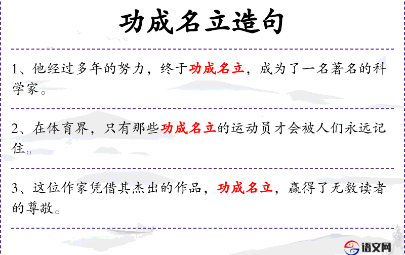 1. 【功成名立】 成:成功;名:名利。建立了功绩,名声也有了。指功绩与名利都得到。