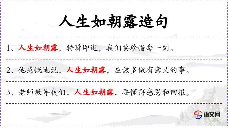 句子:“人生如朝露,转瞬即逝,我们要珍惜每一刻。”