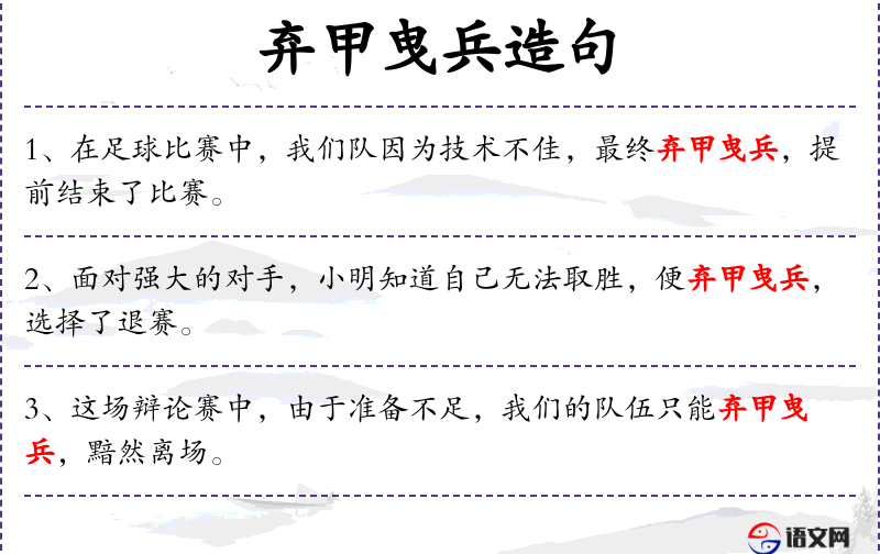 成语“弃甲曳兵”:源自古代战争,形容战败后士兵丢弃盔甲和武器逃跑。在现代语境中,常用来比喻在竞争或对抗中失败。