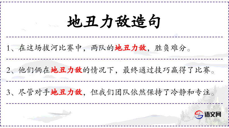 - 地丑力敌:这个成语源自**古代,用来形容双方实力相当,难以分出胜负。在现代汉语中,它常用于描述体育比赛或其他竞争性活动。