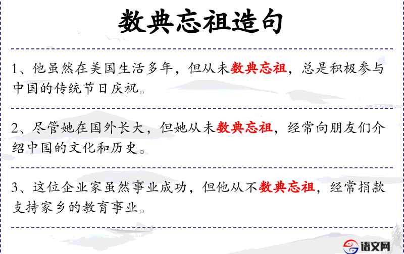 - 从未数典忘祖:比喻不忘本,不忘记自己的根源和文化。