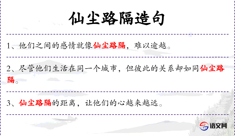 - 仙尘路隔:成语,比喻两者之间距离遥远,难以逾越。