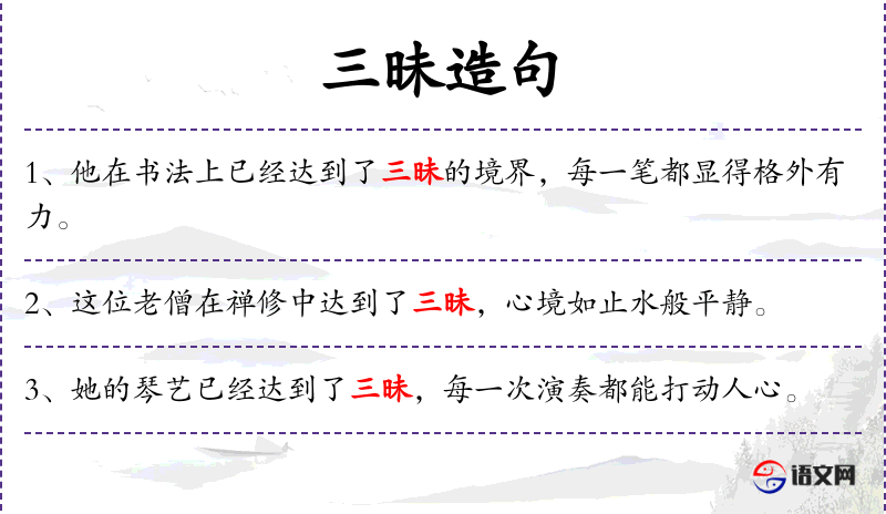 1. 【三昧】 佛教用语,意思是使心神平静,杂念止息,是佛教的重要修行方法之一。借指事物的诀要:深得其中~。