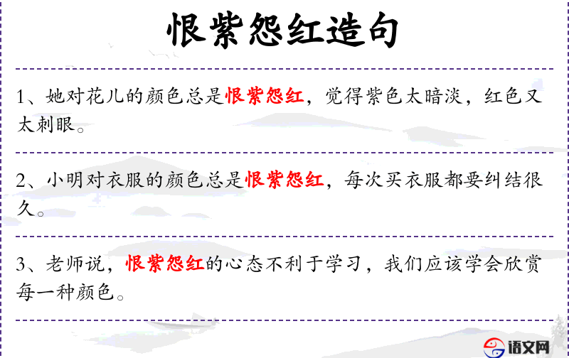 2. 【恨紫怨红】 紫、红:紫色和红色的花,这里泛指各种颜色的鲜花。各种各样的花竞相开放,让人心烦意恨。形容花姿引起人的伤感。