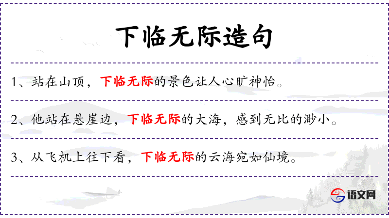 1. 【下临无际】 - 临:居高处朝向低处。从高往下看,望不见底。形容地势极其陡峭。