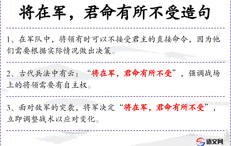 句子中的“将在军,君命有所不受”是一个成语,源自古代军事思想,强调将领在战场上的自主权和灵活性。这反映了传统文化中对军事指挥官的期望和要求。