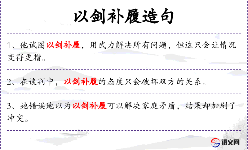 - 以剑补履:这个成语源自古代,剑是武器,履是鞋子,用剑来修补鞋子显然是不合适的。这个成语反映了人对于解决问题方式的智慧和哲学。