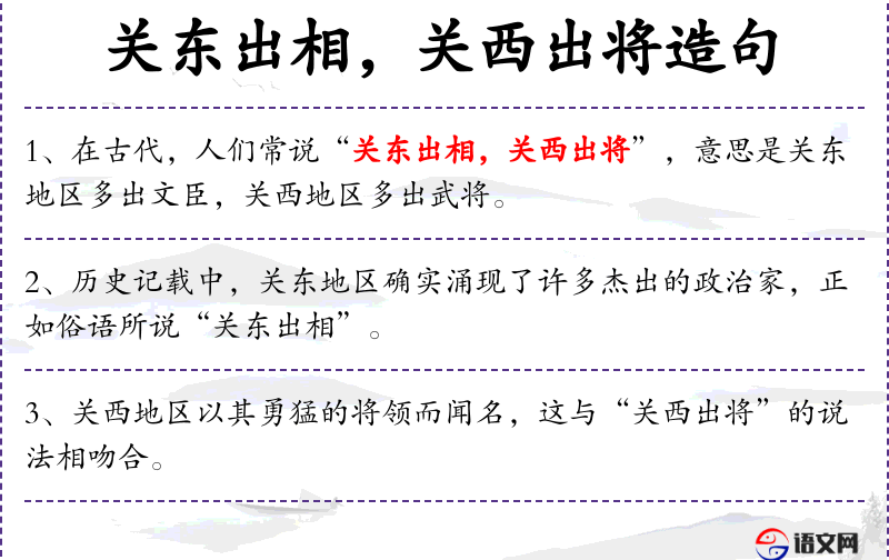 - 在课堂上,老师通过提及“关东出相,关西出将”这一成语,加深了学生对**古代地域文化的理解。