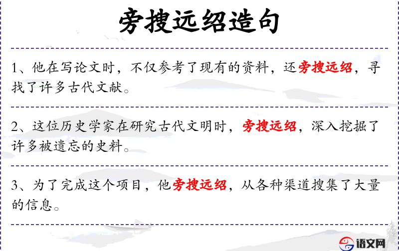 - 旁搜远绍:成语,意为广泛搜集和远距离借鉴,形容搜集资料的广泛性和深入性。