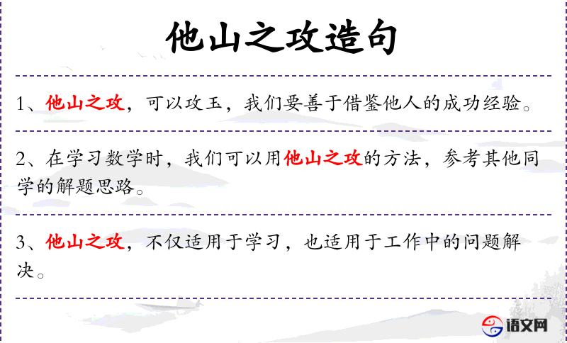 - 他山之攻:这是一个成语,意思是借鉴他人的经验或方法来解决问题。