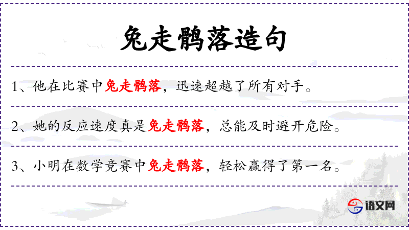 - 兔走鹘落:成语,形容动作敏捷迅速。