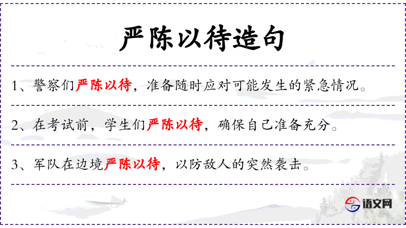 - 严陈以待:成语,意思是严肃认真地准备,确保事情能够顺利进行。
