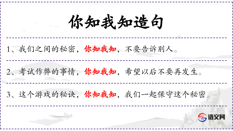 1. 【你知我知】 只有你我两人才知道这个秘密,不能对别人说。