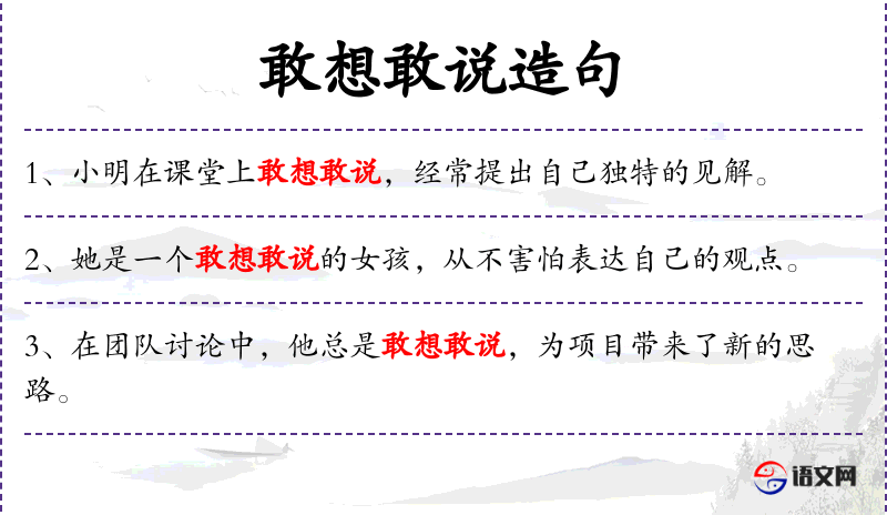 - 敢想敢说:敢(动词,表示有勇气做某事);想(动词,表示思考);说(动词,表示表达)