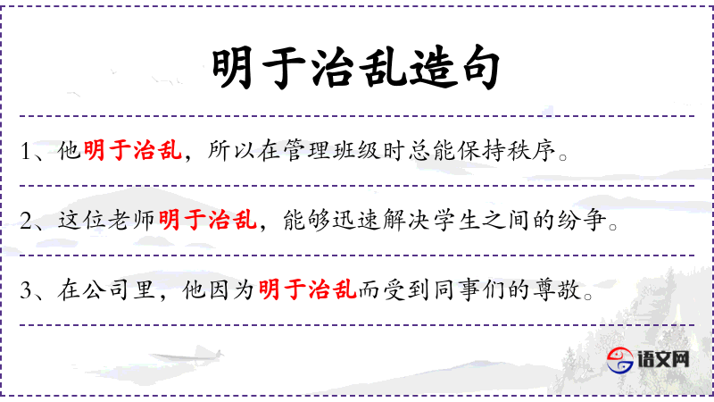 句子:“这位老师明于治乱,能够迅速解决学生之间的纷争。”
