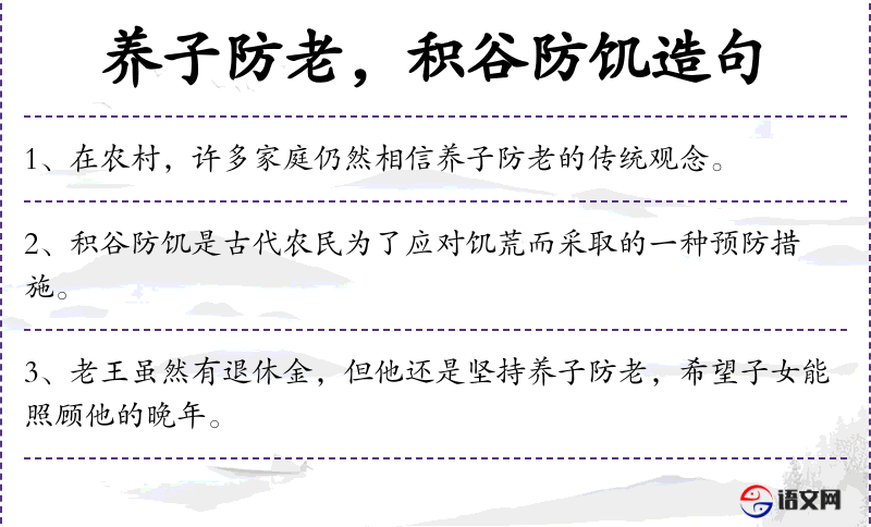 - 宾语:退休金、养子防老、子女能照顾他的晚年